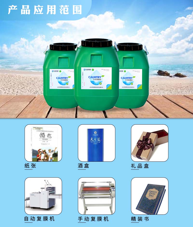 ? ?用于紙張與BOPP膜、PET膜等塑料薄膜的粘合,印刷包裝行業(yè)禮品盒、紙箱、酒盒、酒箱、手提袋等高中低檔紙質盒子、箱子,復合產品干燥時間趕,忠于原色,無色相飄逸。